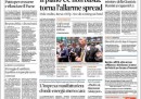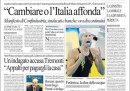 La maggior parte dei giornali di oggi apre con la nomina di Nitto Palma a ministro della Giustizia o con la difficile giornata di ieri per la borsa italiana. Si distinguono quelli che parlano dei guai giudiziari del PD, con vari tagli: l’Unità per difendere il partito, Libero per saltargli addosso, il Corriere della Sera per fornire il contenuto di altri verbali dell’inchiesta sulle presunte tangenti ricevute da Filippo Penati. E poi gli altri molti che si occupano della nota diffusa in serata da sindacati, Confindustria e associazioni di settore, che chiedono “discontinuità” nella politica economica del governo.