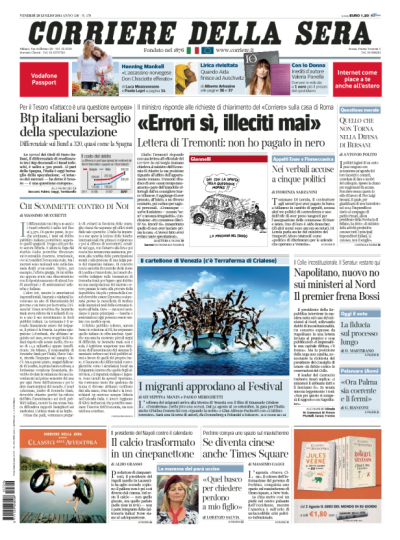 Il Corriere della Sera dà lo spazio di apertura della prima pagina alle risposte di Tremonti sulla questione della casa di Roma di proprietà di Marco Milanese, e alla speculazione sui Btp. Al prolungarsi della polemica tra il Presidente della Repubblica e la Lega sul progetto “ministeri al Nord” lascia uno spazio più in basso, mentre la maggior parte dei quotidiani ne fa la notizia principale. Poi Libero fa “dieci domande” a Bersani, e l’Osservatore Romano prova a ricordare ancora cosa succede in Somalia.