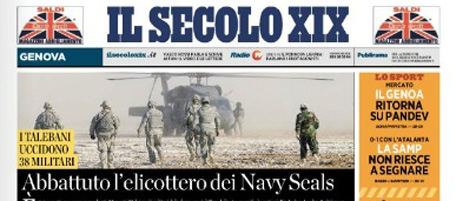 Il declassamento del rating degli Stati Uniti arriva nei titoli maggiori di tutti i quotidiani ormai un po’ stanco, la notizia era di più di 24 ore prima e ormai è stata abbondantemente raccontate e digerita, soprattutto rispetto al suo potenziale narrativo non eccitantissimo per la maggior parte dei lettori. Al Secolo XIX, dove sono sempre molto attenti alle immagini, preferiscono privilegiare la strage dell’abbattimento dell’elicottero afgano, Libero di dedica ancora ai magistrati, in Sardegna hanno una giunta regionale nuova.