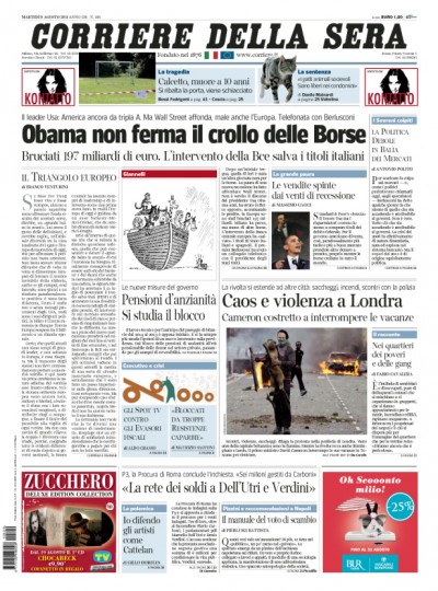 I titoli maggiori delle prime pagine dei quotidiani sono per i disastri delle borse di ieri, ma lo spazio fotografico è affidato da molti naturalmente alle violenze di Londra. Il Mattino sceglie il teppista che è andato per la maggiore anche sui quotidiani inglesi, mentre al Post condividiamo la scelta del cavallo a dondolo (qui in grande), che avevamo annunciato ieri come sicuro protagonista. E poi ci sono le consuete originali scelte di Libero e Giornale.