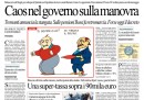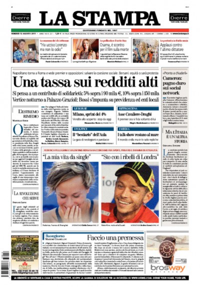 Secondo le aperture dei maggiori quotidiani di oggi, le iniziative di Tremonti per mettere una pezza alla crisi trovano pochi consensi nella maggioranza, Bossi alza un sopracciglio e Libero titola persino al tradimento. Molto interesse sulle prime pagine di Repubblica, del Fatto e dello stesso Libero anche per il menu della Camera dei deputati e le sue tariffe, e altrove per gli strascichi delle violenze londinesi, su cui la Stampa dà spazio a Valentino Rossi.