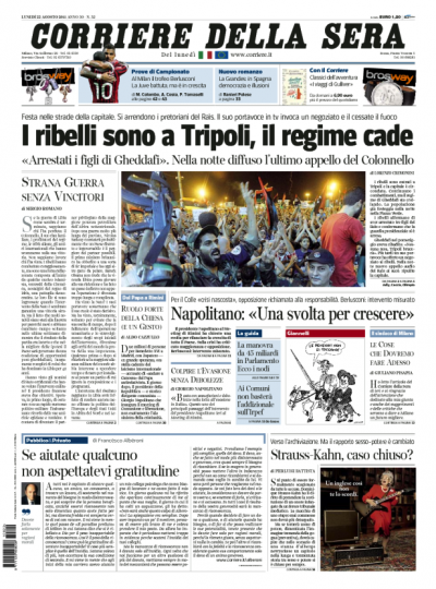 La battaglia di Tripoli apre le prime pagine dei quotidiani nazionali e fa tornare la politica estera in posizioni rilevanti dopo settimane di politica interna ed economia. La conseguenza fondamentale è ridimensionare l’impatto del discorso di Giorgio Napolitano al meeting di Comunione e Liberazione, che altrimenti avrebbe avuto molto spazio, e del noto sgangherato dibattito sugli emendamenti alla manovra economica (lo sgangherato dibattito però prosegue animato, e trova più spazio nei quotidiani locali).