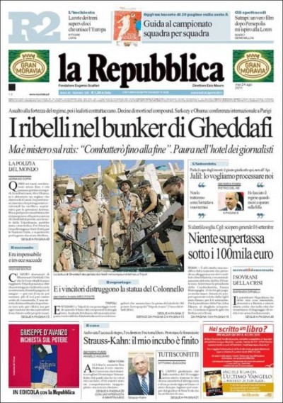 I giornali di oggi hanno in prima pagina molti titoli sulla presa del complesso di Bab al-Azizya da parte dei ribelli a Tripoli, anche se di Muammar Gheddafi continua a non esserci traccia. Non mancano poi gli sviluppi sulla manovra economica e le modifiche che sta subendo. Il Giornale, intanto, invita Luca Cordero di Montezemolo a fuggire dalla politica.
