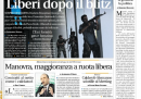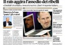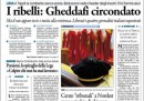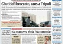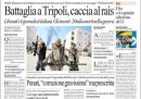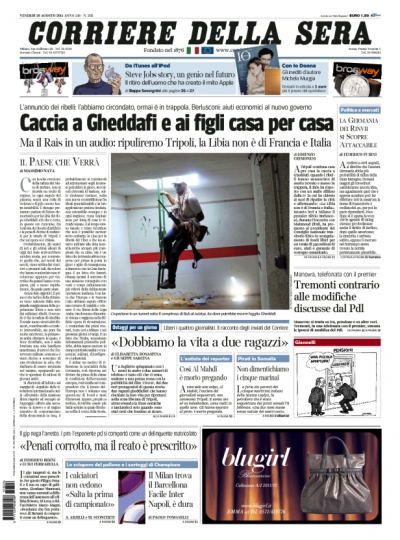 I titoli dei giornali sulla Libia cambiano approccio: al di là della liberazione dei quattro giornalisti italiani, infatti, le notizie dal campo sono poche – la formula della “caccia all’uomo” cela il fatto che nessuno sembra sapere nulla di dove sia Gheddafi – e quindi molti quotidiani preferiscono raccontare l’altro pezzo di storia. La Stampa apre con un duello tra Italia e Francia per i rapporti commerciali con la nuova Libia, in molti raccontano l’incontro di ieri tra il PresdelCons e il leader del Consiglio transitorio libico. Libero continua a prediligere la politica interna, così come il Giornale, e nel dare conto della decisione del GIP di Monza di non arrestare Penati sostiene che la prescrizione è un “cavillo”.