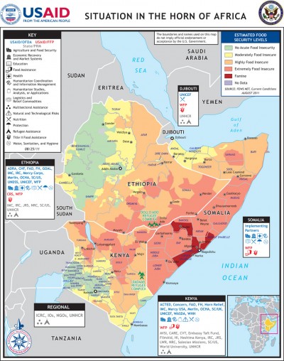 Un prolungato periodo di siccità, il peggiore negli ultimi 60 anni, sta colpendo l’Africa Orientale da diverse settimane, causando una carestia in una delle aree più povere del mondo che interessa circa 12 milioni di persone in Etiopia, in Kenya e soprattutto in Somalia. Le scarse piogge hanno portato alla morte del bestiame e delle coltivazioni di pastori e contadini, oltre a un grande aumento dei prezzi per i pochi beni ancora disponibili. Secondo un rapporto rilasciato negli ultimi giorni dall’agenzia governativa statunitense USAID, le scarse precipitazioni continueranno ancora per molti mesi, e le popolazioni locali saranno in pesante difficoltà fino al raccolto dell’agosto 2012.