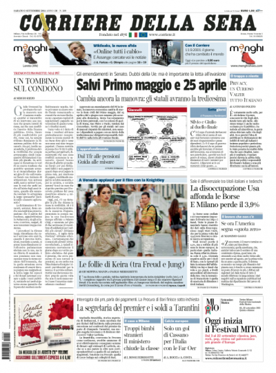 I titoli di oggi si aggirano sulle prime pagine intorno alle foto di Monica Bellucci, Keira Knightley e Kate Winslet a Venezia, e quelli maggiori sono abbastanza eterogenei, pur privilegiando ancora le vicissitudini della manovra economica del governo. Chi privilegia le norme sulle feste nazionali, chi le tensioni con Tremonti, chi le tredicesime. Ma alcuni scelgono il giorno nuovamente difficile delle borse, mentre il Giornale lancia un inatteso “I segreti USA su Berlusconi”, che a ben vedere rivela che i giudici perseguiterebbero il capo del governo.