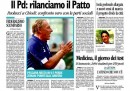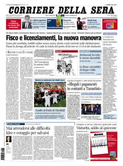 Praticamente tutti i giornali a tiratura nazionale aprono con l’approvazione dell’emendamento alla manovra su contratti e licenziamenti, avvenuta durante la serata di ieri, e i più si limitano nei titoli a riferirne il contenuto (la Stampa va addirittura su due righe per aggiungere dettagli) e commentare altrove. Il Giornale di Brescia dà comprensibilmente parecchio spazio alla morte di Mino Martinazzoli, che era stato anche sindaco di Brescia. Il Tirreno si preoccupa della crisi politica al comune di Livorno.