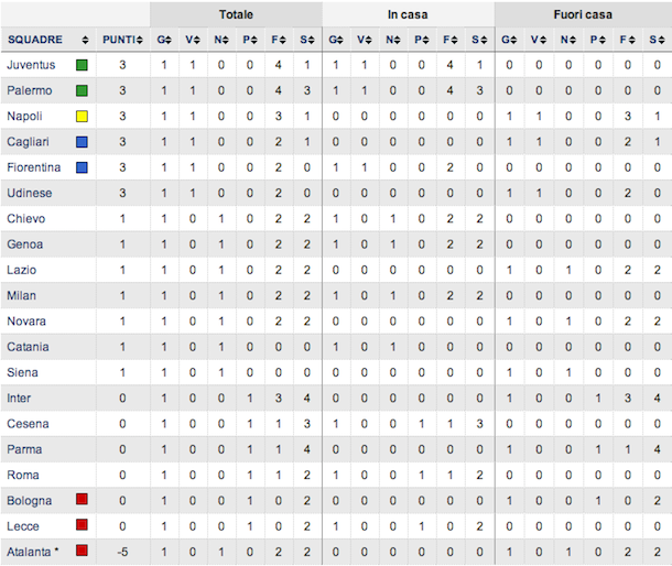 La prima giornata del campionato di Serie A in realtà è la seconda: la prima è stata rinviata a causa del mancato accordo sul contratto dei calciatori e dovrà essere recuperata. Di seguito la classifica, tratta dal sito di Repubblica: per ora non vuol dire molto. Poi i video con tutti i gol.