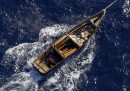 L’imbarcazione su cui si trovavano le nove persone soccorse dalla guardia costiera giapponese al largo della penisola di Noto. (AP Photo/Kyodo News)
