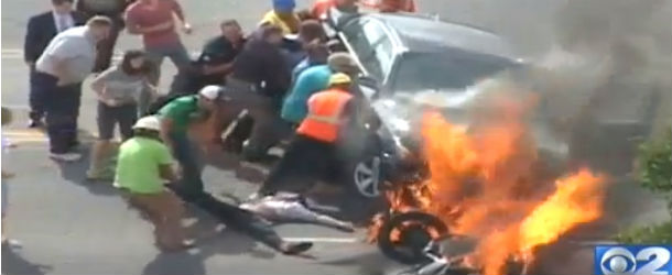 Kelsey Adler, una ragazza di 18 anni, si è sdraiata a terra e ha guardato sotto i resti dell’auto. Si è accorta che Wright era ancora vivo e lo ha detto agli spettatori della scena: in pochi secondi, una dozzina di persone, tra cui alcuni operai di un vicino cantiere, hanno sollevato l’auto (che pesa circa 2 tonnellate) e hanno estratto il ragazzo. Brandon Wright è stato portato via in elicottero e ha buone speranze di sopravvivere, nonostante si sia rotto diverse ossa.
