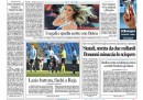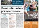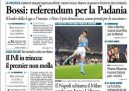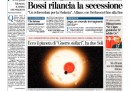 Il rinnovato appello alla secessione di Umberto Bossi occupa gli spazi maggiori sulle prime pagine dei quotidiani principali (ma Repubblica gli preferisce un “Braccio di ferro pm-Berlusconi”, altrettanto déja vu), in qualche caso illustrato dal verde cerimoniale delle immagini della Lega; ma il colore privilegiato da altri giornali è l’azzurro della maglia di Cavani che racconta la vittoria del Napoli sul Milan, domenica sera (il Corriere dello Sport con particolare enfasi, il Corriere della Sera trattenendo a fatica la delusione). La Stampa preferisce un’immagine spaziale, e poi ci sono molto l’intervista di ieri di Dominique Strauss-Kahn alla tv francese, e il risultato delle elezioni berlinesi.