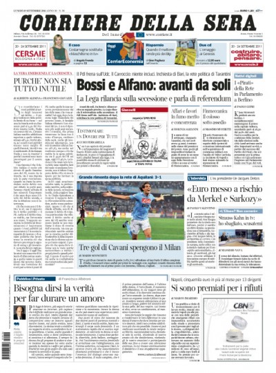 Il rinnovato appello alla secessione di Umberto Bossi occupa gli spazi maggiori sulle prime pagine dei quotidiani principali (ma Repubblica gli preferisce un “Braccio di ferro pm-Berlusconi”, altrettanto déja vu), in qualche caso illustrato dal verde cerimoniale delle immagini della Lega; ma il colore privilegiato da altri giornali è l’azzurro della maglia di Cavani che racconta la vittoria del Napoli sul Milan, domenica sera (il Corriere dello Sport con particolare enfasi, il Corriere della Sera trattenendo a fatica la delusione). La Stampa preferisce un’immagine spaziale, e poi ci sono molto l’intervista di ieri di Dominique Strauss-Kahn alla tv francese, e il risultato delle elezioni berlinesi.