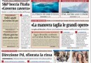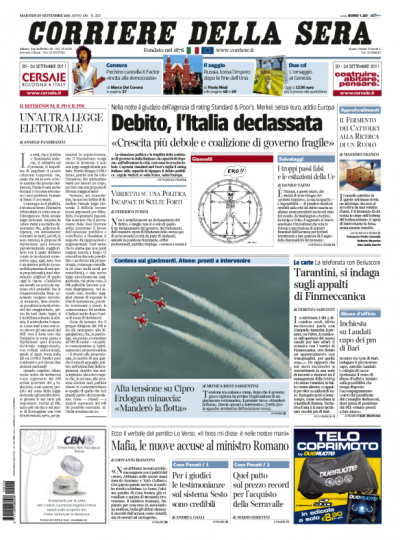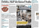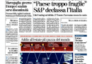 La notizia del taglio del rating sul debito dell’Italia da parte dell’agenzia Standard & Poor’s è arrivata dopo le due del mattino, a giornali già chiusi: oggi la riportano in prima pagina i quotidiani che sono riusciti a modificarla in corsa: in gergo giornalistico, “ribattere”. Altri, soprattutto fra i giornali locali e quelli più politici – l’Unità, il Giornale, il Manifesto, Libero, il Riformista – non hanno fatto in tempo (senza contare che “ribattere” le pagine ha un costo, e più tardi lo si fa e più costa). Repubblica è l’unico grande giornale nazionale a non riportare la notizia del downgrade.