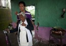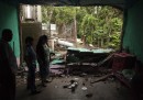 Residents look on inside their damaged house after an earthquake in Cuilapa, Guatemala, Monday, Sept. 19, 2011. Four earthquakes struck the southeastern part of Guatemala in less than two hours Monday afternoon, causing at least one death, authorities said. At least three people were reported missing. (AP Photo/Rodrigo Abd)