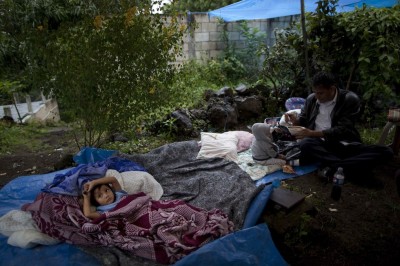 Residents look on inside their damaged house after an earthquake in Cuilapa, Guatemala, Monday, Sept. 19, 2011. Four earthquakes struck the southeastern part of Guatemala in less than two hours Monday afternoon, causing at least one death, authorities said. At least three people were reported missing. (AP Photo/Rodrigo Abd)