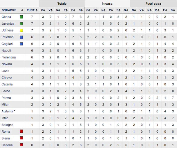 Si è giocato ieri la terza giornata di campionato, turno infrasettimanale che si concluderà stasera con la partita tra Roma e Siena. È stata una giornata di passi falsi: quello dell’Inter contro il Novara è costato la panchina a Gasperini, quelli di Juventus e Napoli sono arrivati piuttosto inaspettati, mentre Milan e Udinese hanno pareggiato a San Siro. La classifica è guidata da tre squadre a sette punti, Juventus, Udinese e Genoa. L’Atalanta ha tolto il segno meno dalla sua posizione di classifica, annullando la penalizzazione senza la quale sarebbe prima in classifica. Di seguito la classifica, tratta dal sito di Repubblica, poi i video con tutti i gol.
