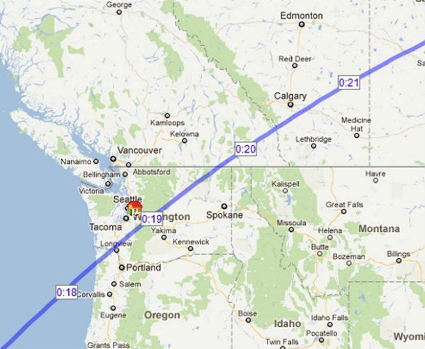 L’orario annunciato dal tweet (compreso tra le 5.23 e le 7.09 ora italiana) è ancora generico, ma la NASA ha detto che sta lavorando per precisare ulteriormente l’orario di rientro. Quanto al luogo della caduta dei detriti, un’area della lunghezza di diverse centinaia di chilometri, quello che si sa al momento è che, nel periodo di circa due ore del rientro, “il satellite stava passando in direzione est sopra Canada e Africa, così come ampie zone degli oceani Pacifico, Atlantico e Indiano.” Parte del tragitto sopra il Canada e l’Africa è ricostruita sul sito N2yo, che ha seguito gli spostamenti del satellite in tempo reale. Alle 9.56 ora italiana, la NASA ha detto che il satellite è penetrato nell’atmosfera terrestre in un punto sopra l’Oceano Pacifico. Secondo informazioni riportate dalla BBC e non ancora confermate, alcuni detriti sarebbero caduti vicino a Okotoks, una cittadina del Canada occidentale a sud di Calgary.