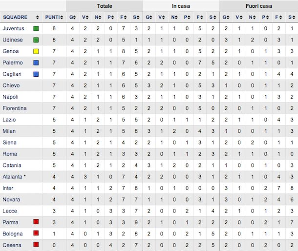 Dopo quattro giornate di campionato le squadre prime in classifica sono due, Juventus e Udinese, ed entrambe oggi hanno pareggiato: la classifica è cortissima, persino più corta di quanto è normale che sia a questo punto della stagione. Ieri hanno vinto Milan e Inter, che però erano abbastanza indietro; ieri hanno pareggiato Napoli e Fiorentina, oggi hanno pareggiato anche Lazio, Palermo, Cagliari e Udinese. L’Atalanta ha quattro punti in classifica: senza la penalizzazione a causa del calcioscommesse sarebbe prima da sola. Stasera la Roma ha battuto il Parma in trasferta. Di seguito la classifica della Serie A, tratta dal sito di Repubblica, poi i gol.