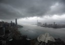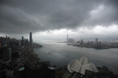 Low dark cloud hangs over an empty Victoria Harbour in the morning during a Typhoon 8 Signal Warning as Typhoon Nesat passed close to Hong Kong on September 29, 2011. Hong Kong locked down on September 29, suspending financial markets, schools and transport services as strong winds from the deadly typhoon Nesat brought disruption to the city. AFP PHOTO / ED JONES (Photo credit should read Ed Jones/AFP/Getty Images)