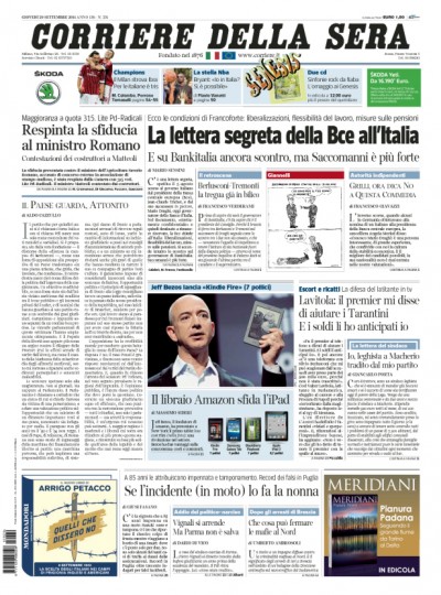 Le notizie che dominano le prime pagine sono due: il fallimento del voto di sfiducia ai danni del ministro per l’Agricoltura, Saverio Romano, e la partita per la successione a Mario Draghi a governatore della Banca d’Italia. Il Corriere della Sera apre però pubblicando il testo integrale, in italiano e in inglese, della lettera ricevuta dal nostro Governo lo scorso 6 agosto dall’attuale governatore della Banca Centrale Europea, Jean-Claude Trichet, e dal suo successore, lo stesso Mario Draghi. È la lettera che chiede al Governo di intervenire con una nuova manovra – spiegando anche dove intervenire – allo scopo di fermare la crisi del debito pubblico.