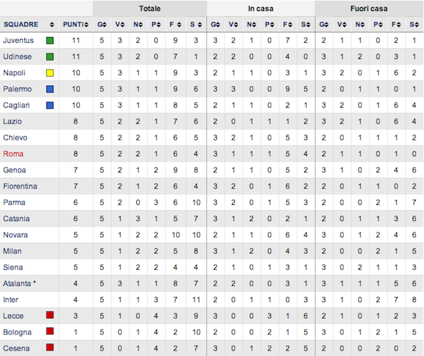 Con questo campionato spezzettato, rischia di essere tutto già successo prima del rituale appuntamento di domenica pomeriggio con le partite, e infatti anche questa volta prima delle 15 di oggi era già successo parecchio: il Novara e il Catania avevano fatto sei gol in due (cinque nel secondo tempo) nel turno di mezzogiorno, e ieri il Napoli aveva maltrattato l’Inter di Ranieri a San Siro e la Roma aveva battuto l’Atalanta, che, ricordiamolo, senza penalizzazione avrebbe 10 punti e non 4. Ma anche oggi sono successe cose belle e interessanti. Su tutte però vogliamo spendere una parola sull’Udinese, che ha venduto i suoi pezzi migliori prima dell’inizio del campionato, eppure dopo cinque giornate giocate è prima insieme a una gran Juventus, che in serata ha battuto il Milan. Segue la classifica, dal sito di Repubblica, e poi i video con tutti i gol.