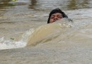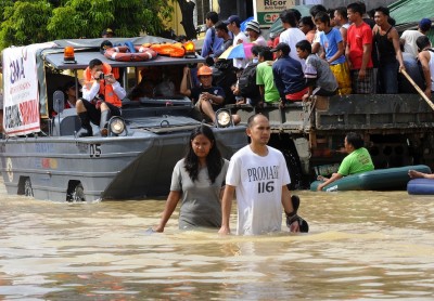 A child plays at a flooded gasoline station in a farming town of Calumpit on October 3, 2011, two hours drive north of Manila in Bulacan province, a flat farming region hit particularly hard by the heavy rains of Typhoons Nesat and Nalgae. Authorities were rushing aid to thousands of people marooned in their flooded homes for nearly a week after deadly typhoons, but said the worst appeared over with waters receding. AFP PHOTO / JAY DIRECTO (Photo credit should read JAY DIRECTO/AFP/Getty Images)
