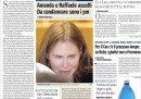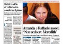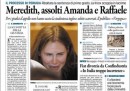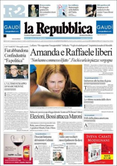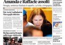La maggior parte dei giornali apre con le notizie da Perugia: Amanda Knox e Raffaele Sollecito sono stati assolti in secondo grado dall’accusa di omicidio nei confronti di Meredith Kercher. Qualcuno grida allo scandalo, altri si fanno delle domande – retoriche, spesso – e moltissimi aprono con le lacrime di Amanda Knox al momento della lettura della sentenza. Spazio è dato anche all’annuncio di Marchionne, che ha confermato che la FIAT uscirà da Confindustria dal primo gennaio. Le pagine sportive, invece, fantasticano ancora sulla Juve.