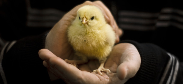 A breeder carries a chick during the Paris International Agricultural fair, at the Porte de Versailles exhibition center, on February 20, 2011 in Paris. AFP PHOTO / FRED DUFOUR (Photo credit should read FRED DUFOUR/AFP/Getty Images)
