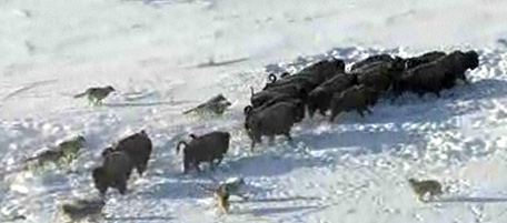I maschi di bisonte arrivano a pesare fino a una tonnellata e sono una preda difficile per i lupi, ma in un ambiente ostile con temperature che arrivano a -50 °C e venti fino a 130 chilometri orari la caccia al bisonte è un rischio da correre per la sopravvivenza. La troupe di Frozen Planet ha dovuto lavorare a stretto contatto con questi animali, incontrando molte difficoltà nel mantenere attive le strumentazioni per le riprese. A quelle temperature le batterie durano pochi secondi, le lenti e i meccanismi che le fanno muovere si congelano bloccando la registrazione. Il problema è stato risolto utilizzando alcuni ingegnosi sistemi per il riscaldamento della strumentazione.
