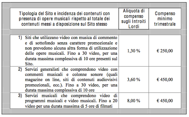 Il caso più diffuso è, ovviamente, il secondo: «Servizi generalisti che comprendono video con commenti musicali e colonne sonore (quali magazine on line, siti di contenuti audiovisivi promozionali, ecc.). Fino a 30 video, per una durata massima complessiva di 10 ore». Va anche calcolato un contributo aggiuntivo nel caso in cui il sito decidesse di diffondere lo stesso contenuto anche tramite social network, seppure con un certo abbattimento delle tariffe.