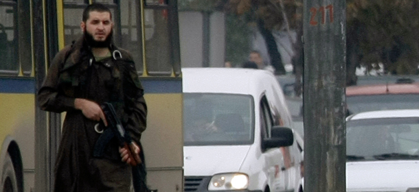 Mevlid Jasarevic (23), stands at an intersection holding an AK-47, after opening fire upon the United States Embassy in Sarajevo, on October 28, 2011. Police acted swiftly and after attempting an arrest, exchanged fire with Jasarevic. The attacker was wounded by Bosnian police, arrested and taken to hospital. His condition is unknown at the moment. AFP PHOTO ELVIS BARUKCIC (Photo credit should read ELVIS BARUKCIC/AFP/Getty Images)