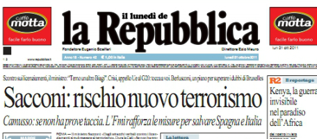 Sui giornali di oggi trovano molto spazio le parole del ministro del Lavoro Sacconi, che ieri si è detto preoccupato dal clima creatosi intorno al tema dei licenziamenti facili e ha parlato apertamente di “terrorismo” e “omicidi”; il leader del PD Bersani e Susanna Camusso hanno replicato dubitando fortemente della presenza di una vera minaccia terroristica in Italia. In Europa, intanto, il presidente del Fondo Monetario Internazionale Christine Lagarde ha comunicato che è stata avviata una revisione dei finanziamenti agli stati membri per prevenire più efficacemente la crisi e limitare i rischi di contagio, e non fa il nome dell’Italia. Si parla anche di Renzi, sebbene non quanto domenica. Molti quotidiani, non solo quelli sportivi, danno conto in prima pagina del malore di Antonio Cassano, da ieri ricoverato nel reparto di neurologia.