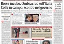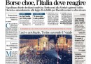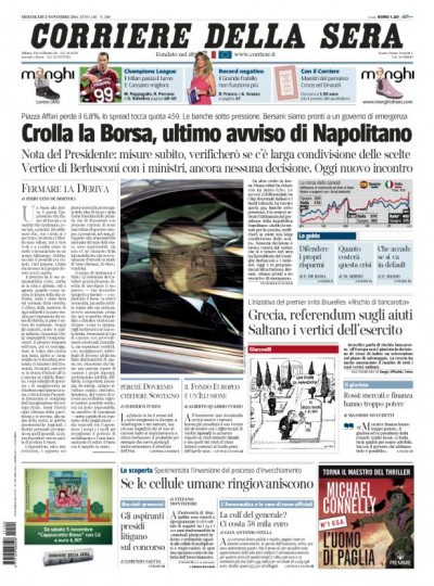 La maggior parte delle prime pagine di oggi apre con l’economia e la politica interna: la decisione del premier greco Papandreou di indire un referendum sul piano di salvataggio europeo ieri ha affondato le borse europee, in particolare quella di Milano. Il presidente della Repubblica Giorgio Napolitano non solo ha rinnovato l’invito a rispettare gli impegni presi con l’Europa ma ha anche annunciato di voler verificare le condizioni per “una nuova prospettiva di larghe intese”; Libero mette le mani avanti e vede in Mario Monti il prossimo premier. Intanto si torna a parlare della possibilità che nel prossimo decreto anti-crisi salti fuori un condono.