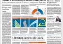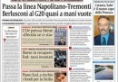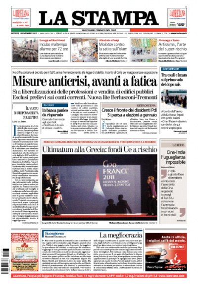 Tutte le prime pagine sono dedicate alla serata del Consiglio dei Ministri, anche se alcune non hanno fatto in tempo a pubblicarne le scelte. Molto spazio anche alla fantomatica “lettera dei frondisti” del PdL a cui ogni giornale decide se attribuire più o meno credibilità. Le immagini sono soprattutto per l’apertura del G20 a Cannes, dove i fotografi sono a proprio agio.