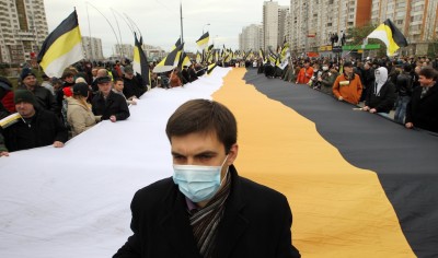 Ultra nationalist demonstrators and activists march carrying the banner reads as “Russian march” to mark National Unity Day on the outskirts of Moscow, Russia, Friday, Nov. 4, 2011. Chanting “Russia for Russians” and “Migrants today, occupiers tomorrow,” about 5,000 people, mostly young men, marched through a working-class neighborhood on the outskirts of the capital, while police stood shoulder to shoulder along the street, which was blocked to traffic.(AP Photo/Alexander Zemlianichenko)