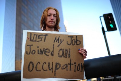 An Occupy LA protestor stands against a wall outside a Bank of America branch covered in anti-big business slogans during a march through the downtown Los Angeles financial district on “Bank Transfer Day,” November 5, 2011. Bank Transfer Day, created by the Occupy movement, is a national effort to get people to move their money from large corporate banks into smaller banks or credit unions. AFP PHOTO / Robyn Beck (Photo credit should read ROBYN BECK/AFP/Getty Images)