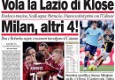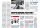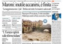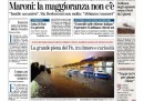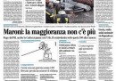 Le prime pagine dei quotidiani danno spazio in simile misura alle parole di Maroni ieri sera in tv da Fabio Fazio (un po’ sintetizzate, ha detto «le notizie di poco fa mi fanno pensare che la maggioranza non c’è più; se la maggioranza non c’è più è inutile accanirsi») e alle piene del Po e inondazioni dei giorni scorsi. Sulla maggioranza, la Nuova Sardegna annuncia “avvicinamenti” di Beppe Pisanu al Terzo Polo. E sui quotidiani sportivi troneggia il rinvio della partita di Napoli per pioggia.