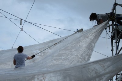 La caratteristica principale del gruppo è la continua ricerca di sperimentazione, di nuove forme e modi. La svolta più concettuale del 2008 li ha spinti a ideare le Tape Installation, enormi strutture di nastro adesivo che ricordano vagamente le ragnatele di alcuni ragni. L’ultima creata, che vedete nelle immagini, è stata realizzata in Federation Square a Melbourne come parte del loro Creative Program, un programma che vuole focalizzarsi su arte pubblica sperimentale su larga scala. La struttura si estende per 16 metri, si eleva a 6 metri d’altezza dal suolo ed è stata realizzata col supporto di speciali piattaforme e l’uso delle pareti esterne della sede dell’emittente televisiva australiana SBS.