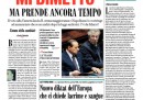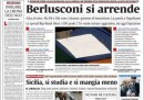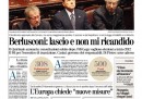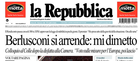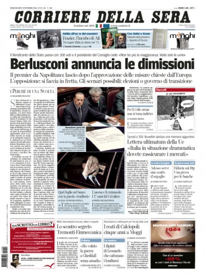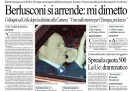Le “dimissioni a tempo” come le chiama il Riformista hanno messo in difficoltà i quotidiani di oggi, che probabilmente immaginavano il giorno della fine di Berlusconi più storicamente roboante: che invece si sia sancito senza avvenire costringe le prime pagine a fare sì i titoloni, ma un po’ trattenuti, e anche i giornali che si immaginavano più euforici restano un po’ spiazzati. Quelli invece più vicini al governo spostano l’attenzione sul fatto che dopo si vada a votare, come è negli annunci della maggioranza, e il Secolo si inventa scelte fedeli alla propria tradizione storica. C’è comunque lo spazio per altre notizie, tra cui quella – che invece non lascia dubbi di scelta ai quotidiani sportivi – delle condanne per l’inchiesta contro Luciano Moggi eccetera.