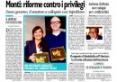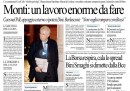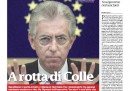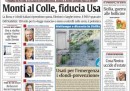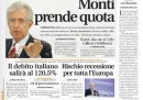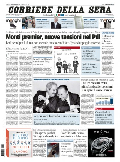 Le prime pagine di oggi aprono con la notizia dell’incontro tra il Presidente della Repubblica Giorgio Napolitano e Mario Monti, appena eletto senatore a vita e candidato più accreditato per il governo tecnico. Molti quotidiani, tra cui L’Unità, già propongono i propri consigli per risolvere la crisi, mentre Libero si mostra scettico guardando alle divisioni nel Pdl, e la Padania annuncia che la Lega mai appoggerà l’eventuale governo Monti. Le altre notizie sono che Lorenzo Bini Smaghi si è dimesso dalla sua carica alla Banca Centrale Europea, mettendo così fine alla crisi diplomatica tra Italia e Francia, e le preoccupazioni di tutti i mercati per la crescita europea, quasi a zero.