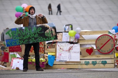 French Indignants camp out at Parisâs La Defense business district on November 14, 2011, as part of a worldwide movement modelled after the anti-Wall Street marches against the banking industry and US authorities. The indignants have occupied the area since November 4, 2011. AFP PHOTO JOEL SAGET (Photo credit should read JOEL SAGET/AFP/Getty Images)