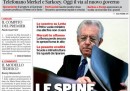 Mario Monti è ancora il protagonista delle prime pagine: dopo il giro di consultazioni, stamattina alle 11 il presidente del consiglio incaricato salirà al Quirinale per sciogliere la riserva a presentare la sua squadra di governo. I quotidiani vicini alla ex-maggioranza hanno già cominciato le critiche: per Libero, Mario Monti è stato lento come un democristiano, la Padania annuncia (ancora) che la Lega non farà parte dell'”ammucchiata”. Le altre testate riportano i veti incrociati che hanno caratterizzato la giornata di ieri intorno alle figure di Gianni Letta e Giuliano Amato. Le altre notizie sono quelle economiche, per nulla buone: i tassi dei Btp hanno superato il 7% e in Francia e in Spagna la situazione peggiora.