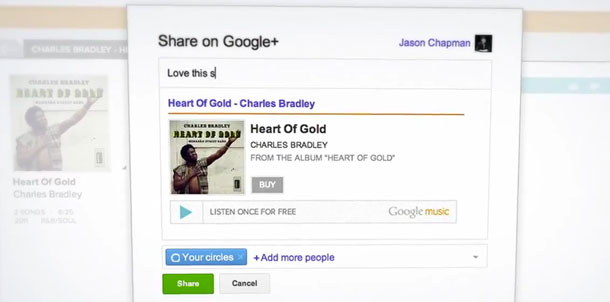 Con Google Music si possono anche condividere le canzoni su Google+, il nuovo social network della società lanciato questa estate. Dopo aver effettuato l’acquisto di una canzone, si può decidere di condividerla nel proprio profilo. Oltre a dare le informazioni sul file musicale acquistato, è possibile ascoltare una volta il brano integralmente in streaming, al posto della sola anteprima da 90 secondi.