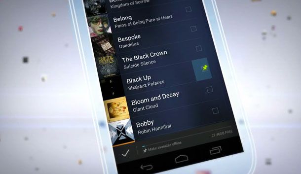 Il servzio è stato concepito per integrarsi al meglio con Android, il sistema operativo per dispositivi mobili di Google. Oltre ad ascoltare la musica direttamente dalla nuvola, l’applicazione per gli smartphone ha una funzione per selezionare un certo numero di canzoni e scaricarle, così da poterle ascoltare anche quando si è offline. La sincronizzazione funziona anche se si acquista una nuova canzone direttamente dagli smartphone Android: la compri sul telefonino e la puoi ascoltare su tutti gli altri dispositivi che ti appartengono con Google Music.