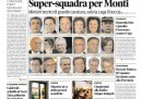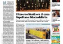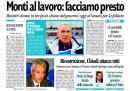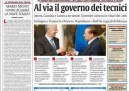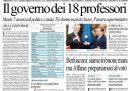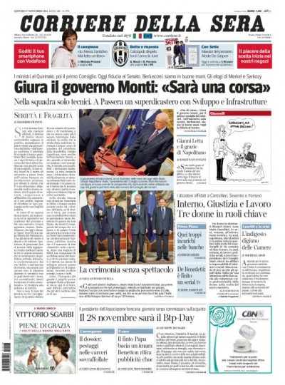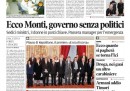 Il nuovo governo Monti è naturalmente il protagonista delle prime pagine di oggi e i quotidiani mettono in risalto diversi elementi: c’è chi sottolinea che sarà un governo “di corsa” nell’approvare le riforme, Libero invece nota la componente tecnica, definendo i ministri dei “secchioni”. La vicinanza di molti nuovi ministri al mondo delle banche e della Chiesa non piace al Giornale, al Manifesto e a Liberazione: si parla di “banchieri di Dio”. L’Unità propone in prima pagina l’immagine delle tre donne che fanno parte della nuova squadra, con dei ministeri molto importanti. In Europa, da notare è l’accoglienza calda di Merkel, Sarkozy e dell’Unione Europea per il nuovo governo italiano.