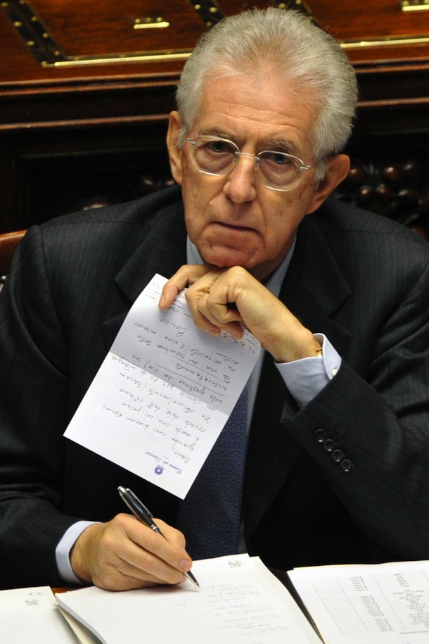 13.04 – Un fotografo in aula ha fotografato un biglietto passato a Mario Monti e firmato Enrico (Letta?):
