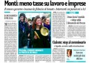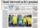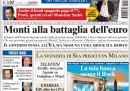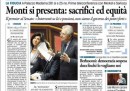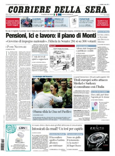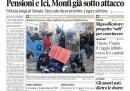 Ancora Mario Monti e il nuovo governo sono naturalmente al centro delle prime pagine di oggi: ieri il nuovo Presidente del Consiglio ha ottenuto la fiducia al Senato e ha presentato il nuovo programma. I quotidiani preparano i lettori a forti interventi sull’Ici, sulle pensioni e sul lavoro. Anche oggi il Manifesto, Libero e la Padania dissentono dal governo con dei titoli piuttosto forti. Intanto nelle piazze, gli studenti hanno manifestato contro le banche e persino contro Mario Monti ancora prima della presentazione del programma, spingendosi, a Milano, fino alla sede della Bocconi.