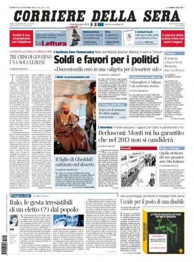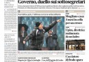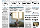 Sulle prime pagine di oggi ci sono due notizie principali: il Corriere e il Giornale aprono decisamente con l’inchiesta Enav-Finmeccanica, in cui sembra essere coinvolto un politico dell’Udc e si fa il nome dell’ex-ministro Giulio Tremonti. L’interesse degli altri quotidiani, soprattutto Repubblica e Sole 24 Ore, va invece verso il nuovo governo, con supposizioni e anticipazioni sul suo operato: si parla di Ici, Iva, di tassa patrimoniale e della nomina dei sottosegretari. Da vedere la prima pagina della Stampa, che celebra il suo centocinquantesimo pubblicando una lettera del Presidente della Repubblica Giorgio Napolitano.