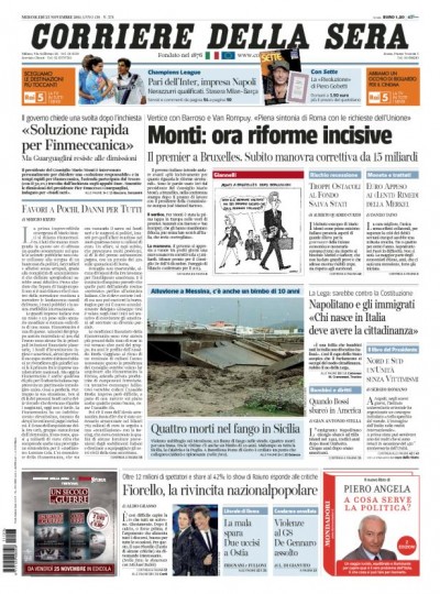 Mentre Mario Monti a Bruxelles rassicura l’Europa sull’incisività e i tempi brevi delle riforme, con una gaffe che il Giornale non gli perdona, in Italia si torna a parlare di cittadinanza agli immigrati: ieri il Presidente della Repubblica ha definito una follia negare la cittadinanza italiana a chi è nato in Italia e ha invitato il nuovo governo a prendere provvedimenti in proposito. La reazione di Libero e, naturalmente, della Padania è forte: liquidano la proposta come una trovata elettorale e invitano a pensare alla crisi economica.