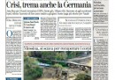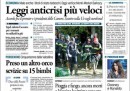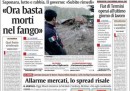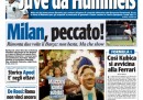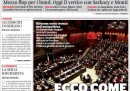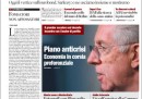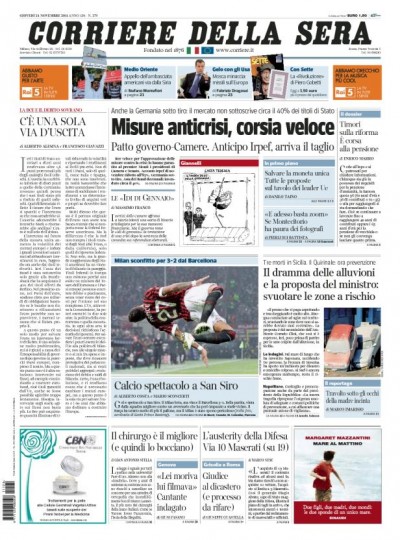 Le prime pagine di oggi aprono con le notizie economiche dalla Germania, dove nell’asta dei Bund di ieri il 36% dei titoli è rimasto invenduto: l’Unità commenta (con una punta di soddisfazione) che ora la Merkel non può più ridere. Anche in Italia la situazione non è rosea, lo spread è risalito ancora e la Borsa italiana è stata ieri la peggiore d’Europa: il Corriere e Repubblica assicurano ai lettori che le misure del governo sono ormai pronte e saranno approvate velocemente. Liberazione e il Manifesto si occupano dei problemi nel PD: una parte del partito ha chiesto le dimissioni di Stefano Fassina da responsabile economico del partito. Le immagini proposte dai quotidiani oggi si dividono tra piazza Tahrir, dove contro la folla è stato usato il gas nervino, e le foto di Kevin Prince Boateng sospeso in aria mentre festeggia il gol al Barcellona. Ieri il Milan ha perso, ma ha tenuto testa ai campioni d’Europa e del mondo.